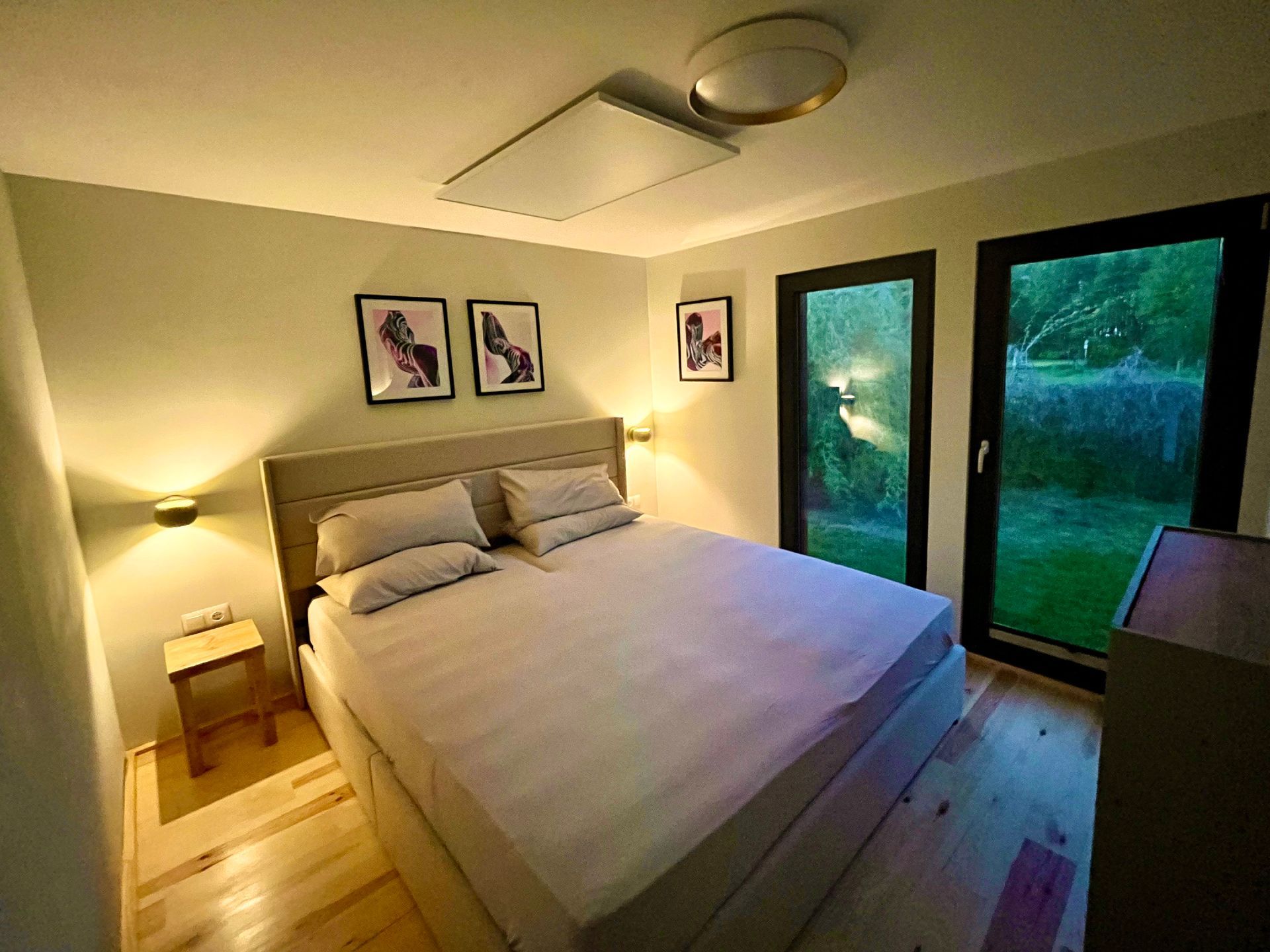 Im Garten von Haus 8 und 9 erwartet Sie ein ganz besonderes Highlight: eine Sauna mit großen Panoramafenstern, buchbar für Ihre persönliche Auszeit. Ob ein wohliger Saunagang im Winter, ein frischer Sprung in den See im Sommer oder ein entspannter Abend zu zweit – hier verbinden sich Natur und Entspannung auf sinnlichste Weise.